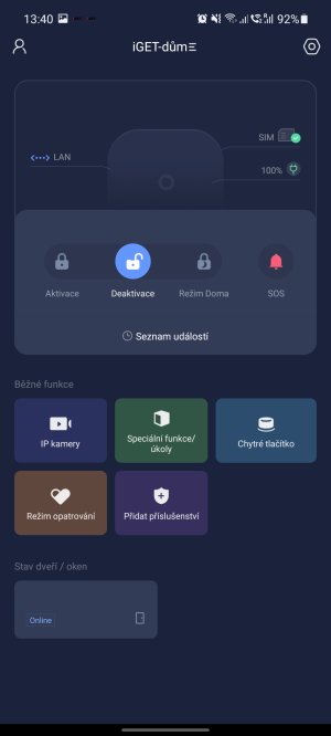 - Funkcia „Ready to Arm“ – pri aktivácii alarmu hlavná jednotka skontroluje, či sú zatvorené všetky okná a dvere, pokiaľ nie, napíše do notifikácie, ktoré zostali otvorené.