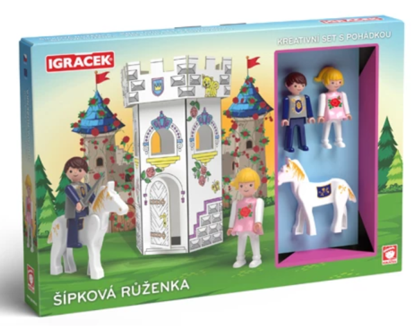 Vymaľuj, zostáv a hraj sa! Kreatívny set Igráčikov s kartónovou skladacou zámockou vežou s predtlačenými motívmi na vymaľovanie podporuje zručnosť a fantáziu detí. Set obsahuje aj dve postavičky Igráčkov Ruženky a Prince s bielym koňom, s ktorými si deti môžu zahrať napríklad divadlo. Doplnené originálnym textom rozprávky O Šípkovej Ruženke s netradičným a zábavným moderným poňatím v CZ a SK verzii. Poznámka: Neobsahuje pastelky, farby ani štetce.