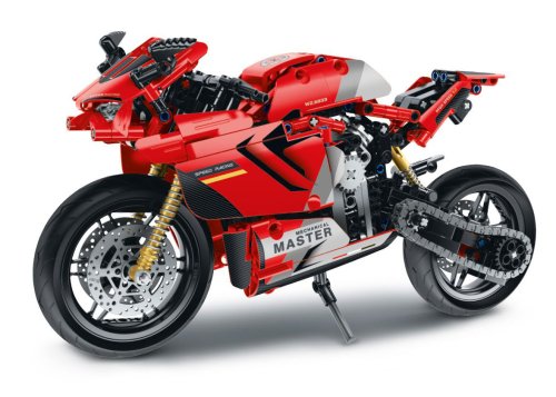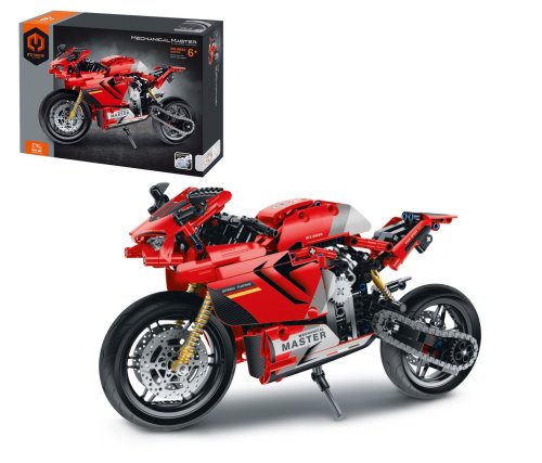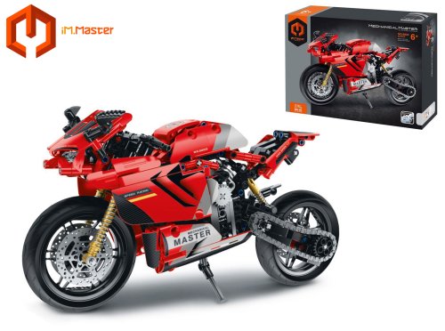 iM.Master Stavebnica motorka červená. Rozmery 32,2x10x16,6 cm. 557 dielikov. Otáčacie zadné koleso s reťazou, fungujúci zadný tlmič.