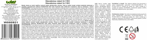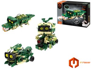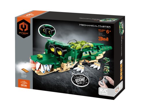 iM.Master Stavebnica robot krokodíl 3v1 RC na diaľkové ovládanie. Rozmery 34,3x14,5x8 cm. 513 dielikov. Ovládanie ovládačom alebo smartphonom. Frekvencia 2.4GHz. Bluetooth prepojenie s mobilom. Aplikácia pre iOS a Android. Svetelné a zvukové efekty. Batériový pack 300mah 7.4V lítium do robota súčasťou, 2xAA do ovládača nie sú súčasťou. USB nabíjací kábel súčasťou. Prepínač ON/OFF na ovládači a batériovom boxe robota.