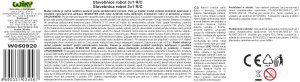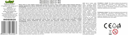 iM.Master Stavebnica robot M 3v1 RC na diaľkové ovládanie. Rozmery 17,2x15x20,7 cm. 435 dielikov. Ovládanie ovládačom alebo smartphonom. Frekvencia 2.4GHz. Bluetooth prepojenie s mobilom. Aplikácia pre iOS a Android. Svetelné a zvukové efekty. Batériový pack 300mah 7.4V lítium do robota súčasťou, 2xAA do ovládača nie sú súčasťou. USB kábel súčasťou. Prepínač ON/OFF na ovládači a batériovom boxe robota.