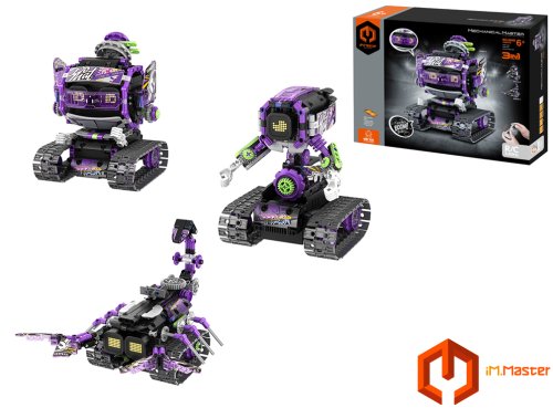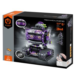 iM.Master Stavebnica robot s čiapkou 3v1 RC na diaľkové ovládanie. Rozmery 17x16,6x20,6 cm. 458 dielikov. Ovládanie ovládačom alebo smartphonom. Frekvencia 2.4GHz. Bluetooth prepojenie s mobilom. Aplikácia pre iOS a Android. Svetelné a zvukové efekty. Batériový pack 300mah 7.4V lítium do robota súčasťou, 2xAA do ovládača nie sú súčasťou. Nabíjací USB kábel súčasťou. Prepínač ON/OFF na ovládači a batériovom boxe robota.