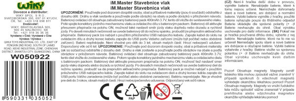 iM.Master Stavebnica vlak modrý. Rozmery vlaku 51,5x13x5,2 cm, železnica 123x71,8 cm. 623 dielikov. Vstavaný batériový pack 400mAh 3.7V lítium do vlaku súčasťou. Nastavenie rýchlosti jazdy vlaku, zmena smeru jazdy dopredu a dozadu. Prepínač ON/OFF. Koliesko na nastavenie smeru jazdy na streche vlaku. Nabíjací USB kábel súčasťou.