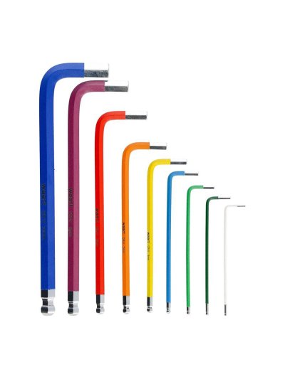 sada obsahuje 9 farebne odlíšených imbusových kľúčov s guličkou: 1,5 mm - biely 2,0 mm - tmavo zelený 2,5 mm - zelený 3,0 mm - modrý 4,0 mm - žltý 5,0 mm - oranžový 6,0 mm - červený 7,0 mm - čierny 8,0 mm - fial