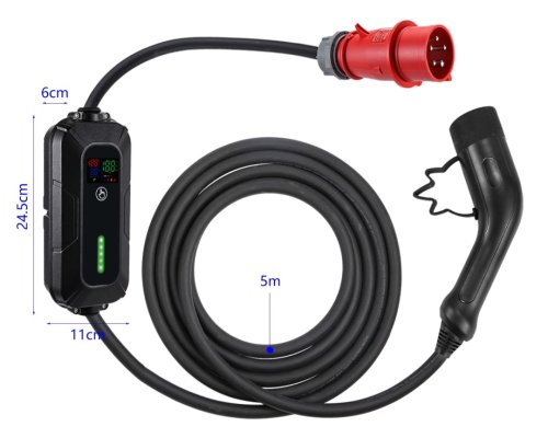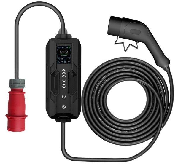 Nabíjačka je vybavená 5metrovým káblom s konektorom CEE (červená zástrčka – 3 fázy) a zástrčkou Type 2, ktorá je štandardom u väčšiny európskych elektromobilov.