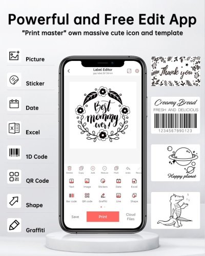 Digitálna Bluetooth tlačiareň samolepiacich štítkov milo prekvapí svojimi vreckovými rozmermi aj rýchlosťou pripojenia k vášmu iOS alebo Android smartfónu. Už žiadne zdĺhavé popisovanie produktov, originálne štítky si vytlačíte za pár sekúnd . V bezplatnej aplikácii si ľahko upravíte text, vložíte vlastný obrázok, vytvoríte originálne návrhy samolepiek, osobné texty, grafiku, čiarové kódy alebo využijete predvolené grafiky. K dispozícii je aj funkcia OCR , ktorá dokáže rozpoznať text na obrázkoch za 3 sekundy a previesť ho priamo na upraviteľný text. Tepelná technológia tlače je veľmi rýchla a navyše znižuje nároky na spotrebný materiál. Výdrž batérie na jedno nabitie je až 150 metrov tlače .