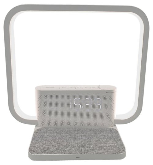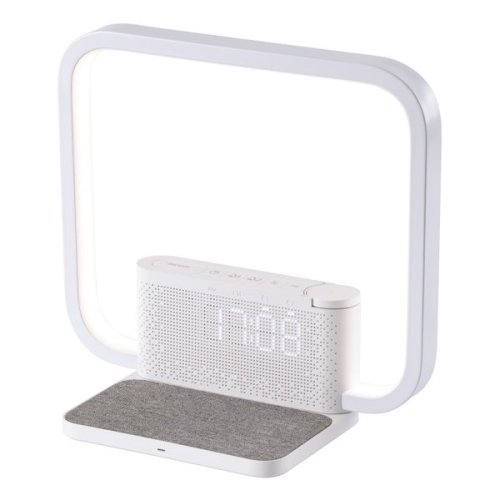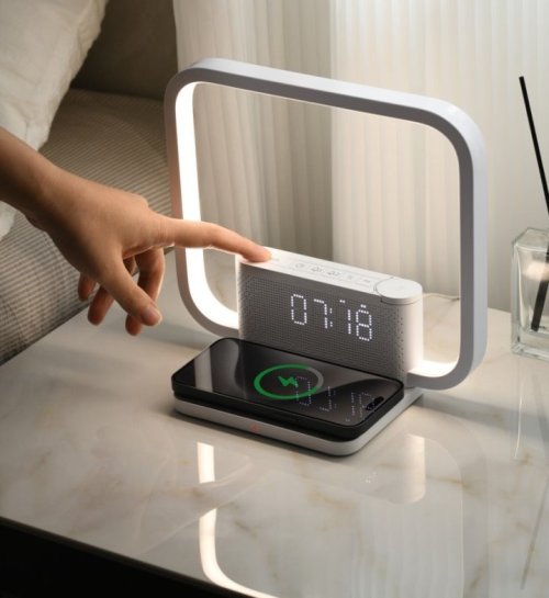 Multifunkčná LED stolová lampa kombinujúca osvetlenie, budík, bezdrôtové nabíjanie a relaxačné zvuky v jednom elegantnom zariadení.