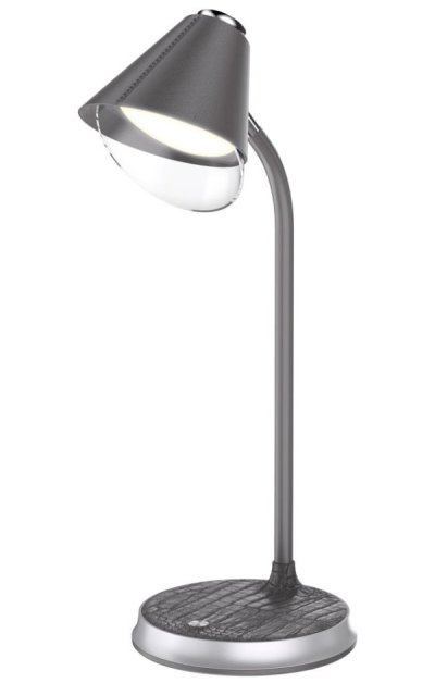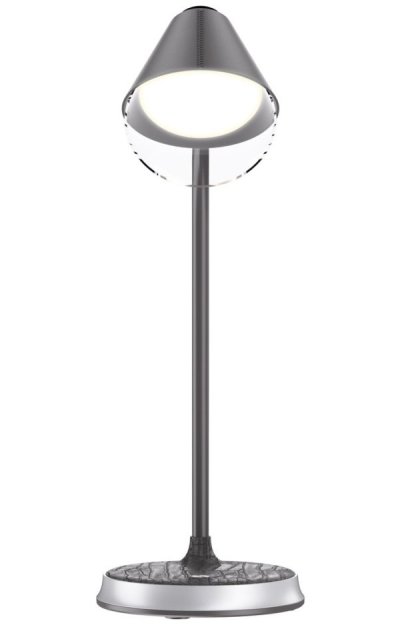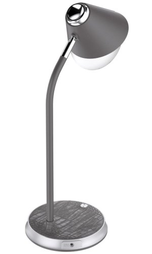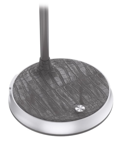 Praktická stolná lampička s pokročilou LED technológiou, naklápacou hlavou a nadčasovým designom. Šedá imitácia kože v kombinácii so striebornými prvkami z nej robí aj štýlový vizuálny doplnok, vhodný napríklad do reprezentatívnych kancelárskych priestorov. Nastavenie intenzity osvetlenia aj farebnej teploty prebieha pomocou jediného dotykového tlačidla . Lampička je vybavená aj bezdrôtovou nabíjačkou štandardu Qi ponúkajúca výkon 10 W. Mobilný telefón s podporou bezdrôtového nabíjania sa začne nabíjať pri obyčajnom položení na nabíjaciu plochu.