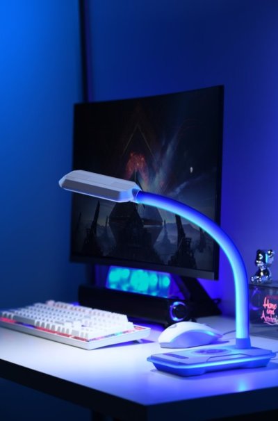 Štýlová stolná LED lampička s RGB podsvieteným ohybným ramenom aj základňou zvýrazní atmosféru herného prostredia. RGB osvetlenie má navyše schopnosť reagovať na zvuky , čo pridáva ďalšiu úroveň interaktivity a zážitku z hrania. Samozrejmosťou je možnosť nastavenia úrovne jasu a farby svetla. Lampička je vybavená bezdrôtovou nabíjačkou štandardu Qi ponúkajúcou výkon 10 W a nabíjacím USB portom. Zariadenie s podporou bezdrôtového nabíjania sa začne nabíjať pri obyčajnom položení na nabíjaciu plochu.