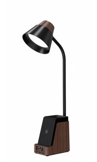 Moderná stolná lampa kombinuje kvalitné osvetlenie s praktickou nabíjacou funkciou pre telefóny, slúchadlá a chytré hodinky. Elegantný dizajn v dekore tmavého dreva s čiernymi prvkami dokonale doplní modernú pracovňu, spálňu alebo detskú izbu.