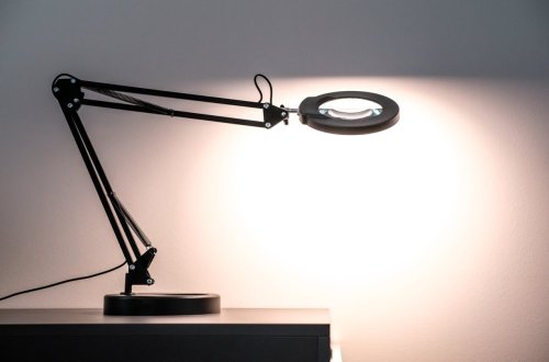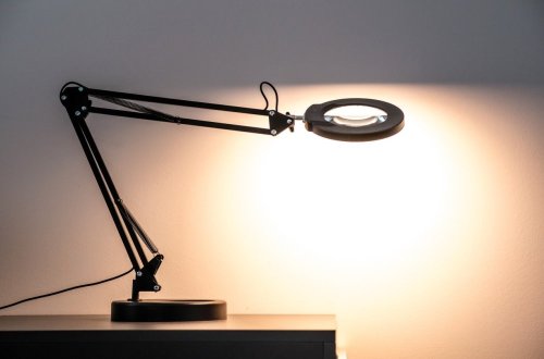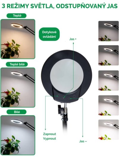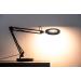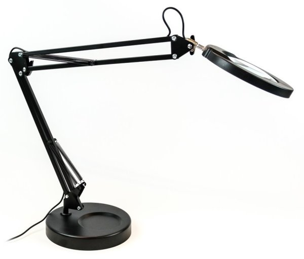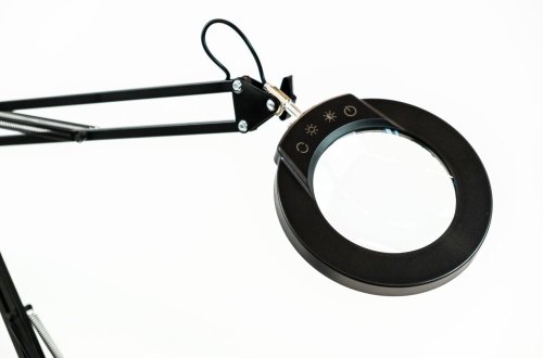 Stmievateľná stolná LED lampička so zväčšovacou sklenenou šošovkou vhodná do dielní, kozmetických salónov, kancelárií atď. Lampu je možné postaviť na plochu alebo pevne upevniť kovovou svorkou na okraj stola. Disponuje flexibilným ramenom s dĺžkou 70 cm a natáčacou hlavou vo všetkých smeroch, čo umožňuje perfektné nastavenie osvetlenia pri práci. Ovládanie lampičky je veľmi jednoduché vďaka dotykovým tlačidlám. Dostatočný priemer lupy (skla) o veľkosti 10 cm umožňuje efektívnu prácu s lupou.