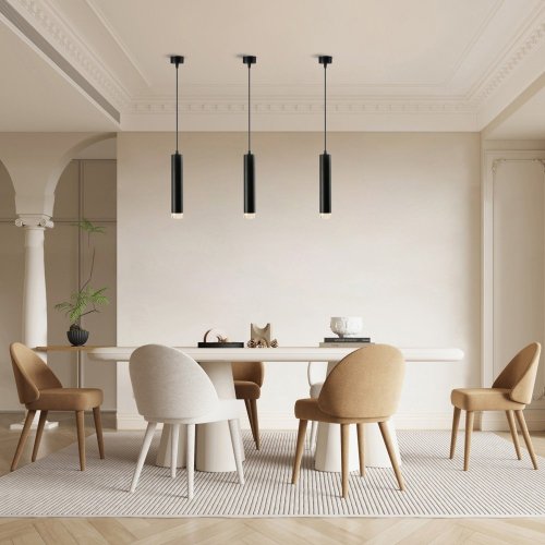 Závesné bodové svietidlo PUNTO predstavuje kvalitné kovové svietidlo v elegantnom, matne čiernom prevedení s akrylátovými prvkami, ktoré je ideálnou voľbou pre funkčné osvetlenie súčasných interiérov. Kovová hlava je zavesená na nastaviteľnom závese s dĺžkou až 100 cm, umiestnenom na okrúhlej základni s priemerom 6 cm. Osadené je päticou GU10 pre inštaláciu žiarovky o max. príkone 9 W . Hlavu svietidla je možné pre ľahšiu inštaláciu žiarovky odskrutkovať.
