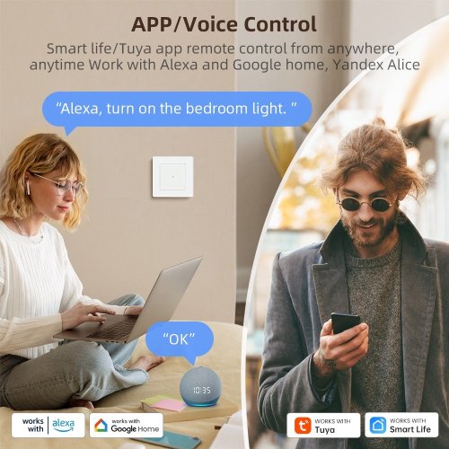 Vypínač sa ľahko inštaluje do štandardnej elektroinštalačnej krabice podľa EU špecifikácie a podporuje zaťaženie až 800 W . Mobilná aplikácia umožňuje vytvárať časové plány osvetlenia alebo inteligentné scény v jednotlivých miestnostiach. Kompatibilita s iOS, Android systémami a podporou viac ako 60 jazykov zaisťuje univerzálnu použiteľnosť.