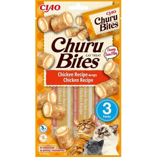 Churu Bites sú šťavnaté, krémové a extra lahodné maškrty v tvare vankúšikov s kuraťom z farmárskeho chovu plnené mäsovým pyré z kurčaťa. (grain-free), bez pridaných konzervantov a umelých farbív. Sú tiež ideálne na ukrytie tablety na odčervenie či iného lieku, ktorý je potrebné mačke nenásilne podať. kvasnice a ich súčasti, extrakt zo zeleného čaju. Analytické zložky: hrubý proteín 28 %, hrubý tuk 5 %, hrubá vláknina 0,3 %, hrubý popol 1,8 %, vlhkosť 63 %. Doplnkové látky na 1 kg: živice 0,1 g. Senzorické prísady: ochucovadlá. Nutričné prísady: vitamín E 121 mg. žuť obalový materiál a dbajte, aby ho nespolkla. Pri kŕmení z ruky buďte obzvlášť opatrní.