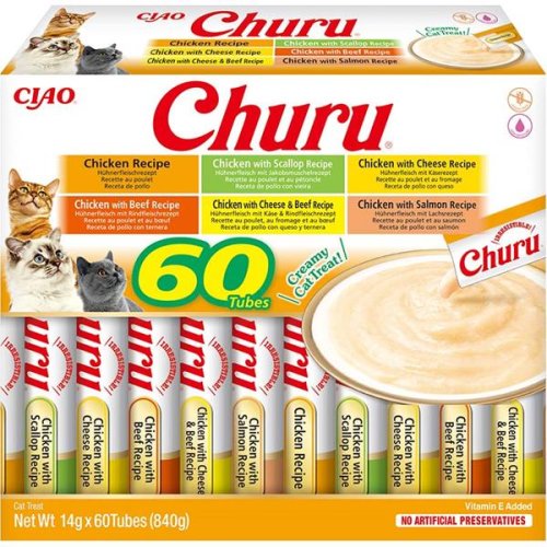 Výber vašich obľúbených krémových kuracích pamlskov Churu pre mačičky všetkých vekových kategórií. Výber krémových pamlskov Churu vo variácii s kuraťom. Balenie obsahuje celkom 60 maškrty: 10x kuracie, 10x kuracie so syrom, 10x kuracie s hovädzím, 10x kuracie so syrom a hovädzím, 10x kuracie s hrebenatkou a 10x kuracie s lososom. Maškrtenie s nízkym obsahom kalórií, bez konzervantov, chemických aróm, bez farbív a umelých dochucovadiel. Inovatívna mäkká konzistencia maškrty Churu vám umožní tráviť spoločné chvíle s vašou mačičkou hravým a interaktívnym spôsobom. Mačacie maškrty Churu majú vysoký obsah vody a vďaka tomu sú vhodným doplnkom k suchému krmivu alebo pre mačky, ktoré málo pijú. Maškrty Churu sú 100% prírodné a zdravé maškrtenie pre mačičky všetkých vekových kategórií. Chúru sú ideálne na ukrytie tablety na odčervenie či iného lieku, ktorý je potrebné mačke nenásilne podať. Zloženie: Kuracia receptúra: kura 30%, tapioka (sušená), výťažok z hrebenatky, kolagén. Receptúra kura s hrebenatkou: kura 28,2%, tapioka (sušená), hrebenatka 1,8%, výťažok z hrebenatky, kolagén. Receptúra kura so syrom: kura 27,9%, tapioka (sušená), syr 2,1%, výťažok z kurčaťa, kolagén. Receptúra kura s hovädzím: kura 28,2%, tapioka (sušená), hovädzie 1,8%, výťažok z kurčaťa, kolagén. Receptúra kura so syrom a hovädzím: kura 26%, syr 2,2%, tapioka (sušená), hovädzie 1,8%, výťažok z kurčaťa, kolagén. Receptúra kura s lososom: kura 28,2%, tapioka (sušená), losos 1,9%, výťažok z hrebenatky, kolagén. Balenie: 60 ks