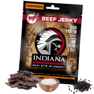 Jerky všeobecne označuje surové mäso, z ktorého je odstránený tuk a následne je nakrájané a vysušené. Indiana Jerky ako taká potom náš náčelník vyrába podľa starých indiánskych receptúr. Indiana Jerky sú tenko nakrájané plátky chudého mäsa, ďalej marinované, sušené a zaúdené. Sušenie prebieha niekoľko hodín tak, aby si východisková surovina zachovala ako prirodzenú chuť mäsa, tak aj svoju šťavnatosť a pružnosť. Pre športovcov alebo zdatného výletníka nie je zdravšie, rýchlejšie a výživnejšie desiaty ako vrecko Indiana Jerky. Je to ľahká, na dotyk nemastná pochúťka, ktorá obsahuje až 73% proteínov a len minimum tuku. Na výrobu bol zvolený závod, ktorý spĺňa najprísnejšie hygienické normy. Tu je Jerky vyrábané na strojoch v majetku firmy Indiana sro .. Prednosti: