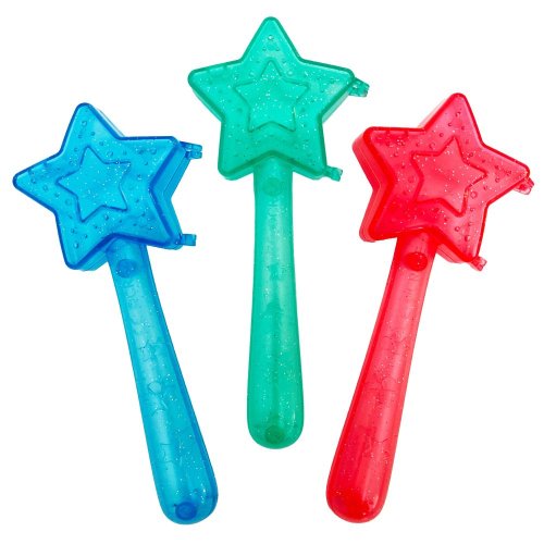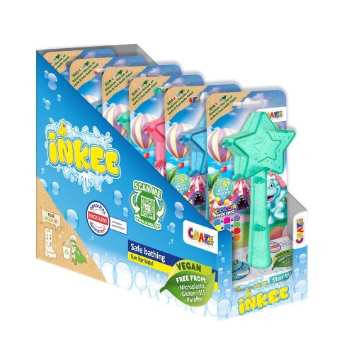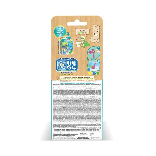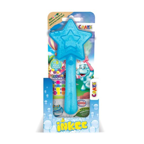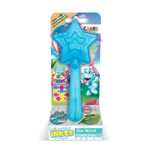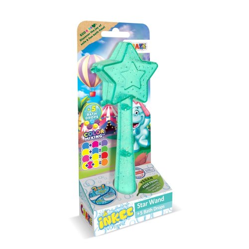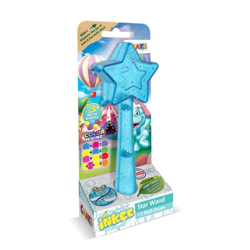 Špeciálna kúzelná palička v tvare hviezdy - 3 farby paličky na jednom displeji. Každý prútik obsahuje: 5 kvapiek do kúpeľa (2x purpurová, 2x žltá, 1x modrá). Je možné ich zmiešať a vytvoriť tak nové farby. Každá kvapka môže zafarbiť až 80 l vody.