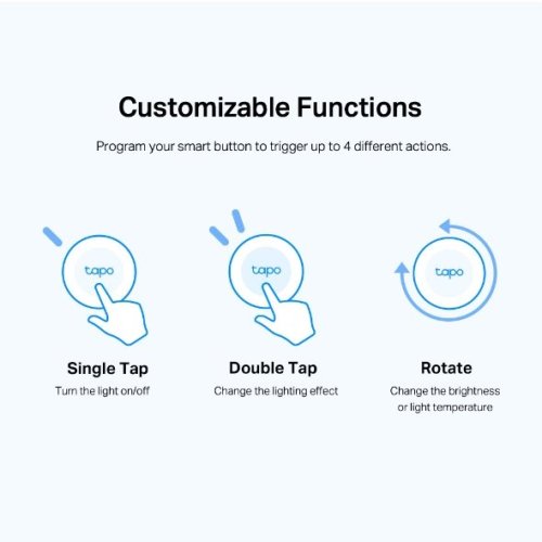 Inteligentné bezdrôtové tlačidlo TP-Link Tapo S200B ocení každý, komu nevyhovuje ovládanie smart osvetlenia, elektroniky a iných zariadení Tapo pomocou hlasu alebo aplikácie. Jediným kliknutím zhasnete alebo vypnete zariadenie, dvojitým kliknutím zmeníte efekt osvetlenia a rotáciou si prispôsobíte jas a teplotu svetla.
