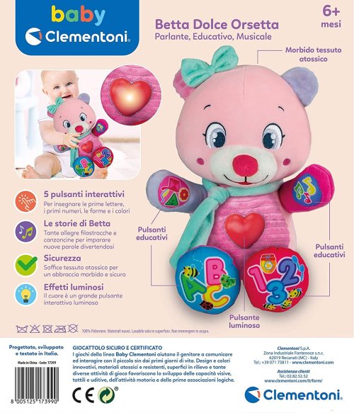 Na prevádzku výrobku je potrebné 2 ks 1,5 V batérie AAA (súčasťou balenia iba na demostračné účely). Rozmery: 30 x 20 x 15 cm. Upozornenie: Návod na použitie je na obale výrobku vo vyššie uvedených jazykoch. Obrázky balenia sú iba na ilustratívne účely. Značka BABY CLEMENTONI je synonymom kreativity, nadšenia a dôrazu na kvalitu. Hračky pomáhajú rodičom pri komunikácii s dieťaťom. Vzhľad hračky a jej inovatívne farby, netoxické a pevné materiály, vytvarovaný povrch a rôzne funkcie pomáhajú pri rozvoji hmatových a sluchových schopností, napomáhajú pohybovej aktivite a vyvolávajú prvé logické asociácie.