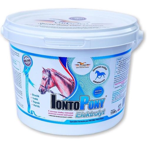 Iontopóny Elektrolyt je minerálne doplnkové krmivo pre kone s obsahom minerálnych solí a bielkovín určené na vyrovnanie elektrolytickej bilancie porušovanej stratami iónov potom v období zvýšenej záťaže. V priebehu fyzickej záťaže stráca organizmus koňa v závislosti na intenzite a dĺžke trvania záťaže, teplote a vlhkosti prostredia 5 až 15 litrov tekutín vo forme potu. Pot koňa je silne hypertonický a obsahuje značné množstvo iónov sodíka, draslíka a chlóru, vysoké percento bielkovín (prevažne albumínov) a ďalej významné množstvo iónov vápnika a horčíka. Ideálny obsah vody a iónov v tele má svoju hornú a dolnú hranicu. V tomto fyziologickom rozmedzí prebiehajú všetky deje výmeny látok a energií ideálnym spôsobom. Akákoľvek zmena nad a pod toto ideálne rozmedzie má okamžitý priamy vplyv na výkonnosť. Tento negatívny vplyv je o to väčší, čím je väčšia zmena v obsahu týchto látok. Optimalizácia obsahu iónov a vody v tele je základným predpokladom ako pre efektivitu tréningového procesu, tak aj pre kvalitu vlastného výkonu. IONTOPÓNY Elektrolyt svojim zložením napodobňuje zloženie konského potu a navracia tak do organizmu látky skutočne potom vylúčené v optimálnom množstve a pomere. Rozsah dávkovania umožňuje príjem práve takého množstva elektrolytov, ktoré kôň pri danom tréningu stratí. Podávanie IONTOPÓNY Elektrolyt udržuje homeostázu organizmu koňa, stabilizuje výkonnosť a prispieva k rýchlejšej regenerácii koňa. Indikácia: