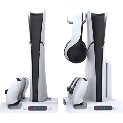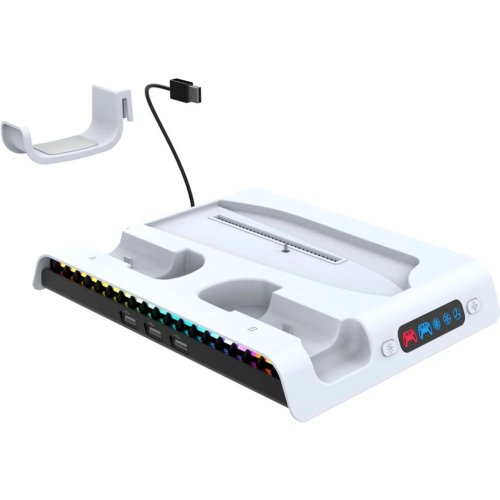 Nabíjacia stanica pre PlayStation 5 Slim s aktívnym chladením, RGB podsvietením, držiakom na slúchadlá, USB porty a nabíjacími kolísky pre dva ovládače DualSense. Vďaka minimalistickému dizajnu, ladiacej s hernou konzolou, doplní váš herný kútik a zaistí vám stále miesto na odkladanie herných ovládačov. Stanica je vybavená štýlovým RGB podsvietením, v ktorom sa kombinuje 9 farebných odtieňov. Podsvietenie je možné samozrejme vypnúť pomocou tlačidla na dokovacej stanici.