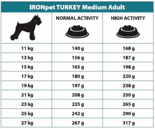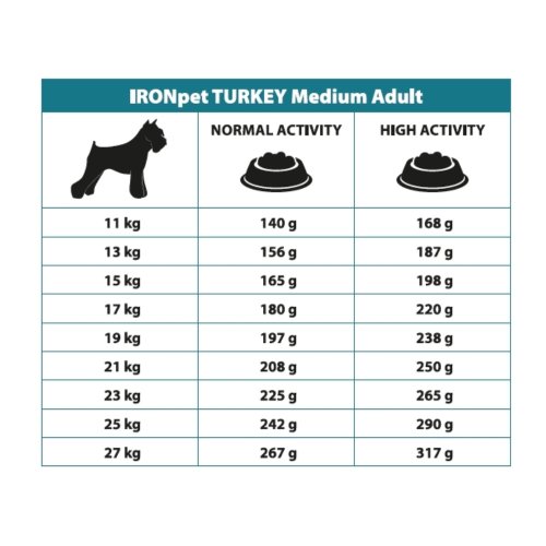 Jediný zdroj živočíšnych bielkovín s vyváženým pomerom bielkovín a tuku je použité morčacie mäso - monoproteínová strava výrazne znižuje riziko vzniku intolerancií a potravinových alergií. IRONpet Dog Adult Medium Turkey (Krocan) neobsahuje lepok a kuracie mäso je teda hypoalergénne, ľahko stráviteľné a vhodné aj pre psov s citlivým trávením.