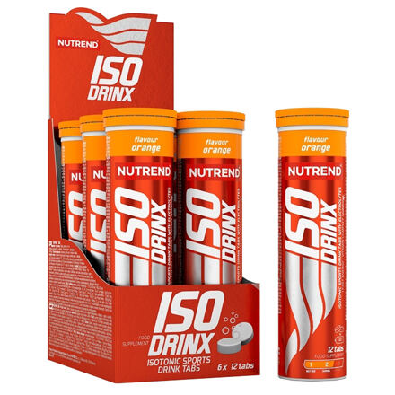 Profesionálny športový nápoj s elektrolytmi v podobe rozpustných tabliet, ktoré umožňujú presné a jednoduché dávkovanie. V každom balení je 12 tabliet s obsahom značkového disacharidu izomaltulózy (Palatinose™), zaisťujúce postupné vstrebávanie. Isodrinx Tabs: izotonické aj hypotonické riedenie; elektrolyty; zmes 10 vitamínov; bez umelých farbív; praktické balenie rozpustných tabliet. Odporúčané dávkovanie: Popíjajte pred a počas záťaže . Použitie: pomer riedenia pre ISOtonický nápoj je 1 tableta do 250 ml vody (osmolalita 275-305 mOsm/kg), pomer riedenia pre HYPOtonický nápoj je 1 tableta do 375 ml vody (osmolalita menej ako 250 mOsm/kg). Po otvorení skladujte pri teplote 25 ° C a spotrebujte do 3 mesiacov. Príchuť citrón: glukóza, regulátor kyslosti kyselina citrónová, hydrogénuhličitan sodný, 6 % izomaltulóza (je zdrojom fruktózy a glukózy) - Palatinose TM, nosič polyetylénglykol, uhličitan vápenatý, stabilizátor zmes akáciové horečnatý, aróma, dihydrogénfosforečnan draselný, vitamínový premix (kyselina L-askorbová, DL-α-tokoferylacetát, nikotínamid, D-pantotenát vápenatý, pyridoxín hydrochlorid, riboflavín, tiamín mononitrát, kyselina pteroová kyanokobalamín), sladidlá sukralóza a acesulfam K. Príchuť pomaranč: glukóza, regulátor kyslosti kyselina citrónová, hydrogénuhličitan sodný, 4 % izomaltulóza (je zdrojom fruktózy a glukózy) - Palatinose TM, nosič ély akáciové a xantánové gumy, aróma, chlorid sodný, uhličitan horečnatý, dihydrogénfosforečnan draselný, vitamínový premix (kyselina L-askorbová, DL-α-tokoferylacetát, nikotínamid, D-pantotenát vápenatý, pyridox kyselina pteroylmonoglutamová, D-biotín, kyanokobalamín), sladidlá sukralóza a acesulfám K, farbivo beta-karotén. Príchuť malina: glukóza, regulátor kyslosti kyselina citrónová, hydrogénuhličitan sodný, 4 % izomaltulóza (je zdrojom fruktózy a glukózy) - Palatinose TM, nosič polyetylénglykol, koncentrát z červenej repy, uhličitan vápenatý, uhličitan vápenatý chlorid sodný, uhličitan horečnatý, dihydrogénfosforečnan draselný, vitamínový premix (kyselina L-askorbová, DL-α-tokoferylacetát, nikotínamid, D-pantotenát vápenatý, pyridoxín hydrochlorid, riboflavín, tiaboná D-biotín, kyanokobalamín), sladidlá sukralóza a acesulfam K. Upozornenie: Tablety na prípravu ochuteného nealkoholického nápoja obohateného o vitamíny, s cukrami a sladidlami. Vhodné najmä pre športovcov. Nie je určené pre deti do 3 rokov. Ukladajte mimo dosahu detí. Skladujte v suchu pri teplotách do 25 ° C, mimo dosahu priameho slnečného žiarenia. Chráňte pred mrazom! Výrobca neručí za prípadné škody vzniknuté nevhodným použitím alebo skladovaním. Dodávateľ: NUTREND DS ., as ., Chválkovice 604, 779 00 Olomouc, Česká republika