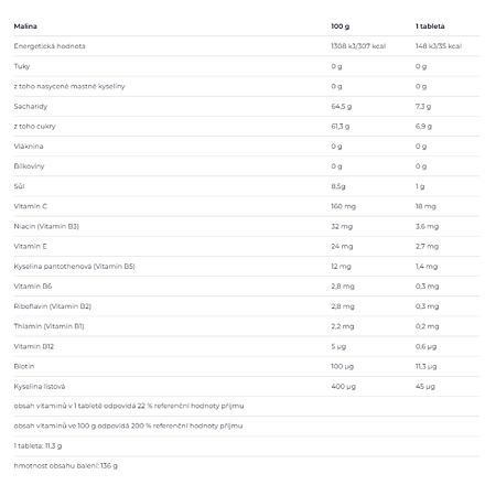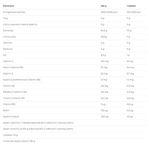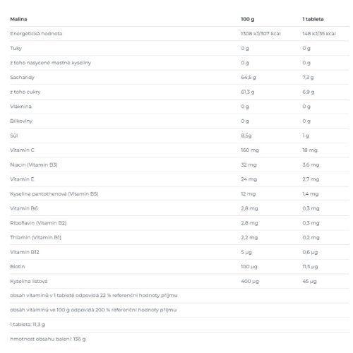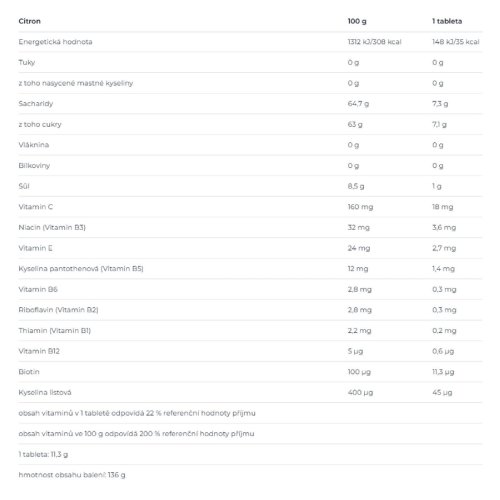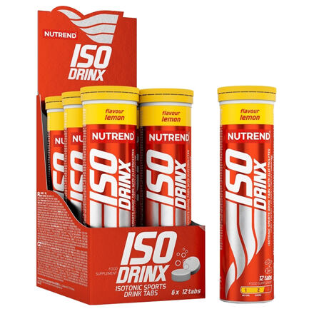 Profesionálny športový nápoj s elektrolytmi v podobe rozpustných tabliet, ktoré umožňujú presné a jednoduché dávkovanie. V každom balení je 12 tabliet s obsahom značkového disacharidu izomaltulózy (Palatinose™), zaisťujúce postupné vstrebávanie. Isodrinx Tabs: izotonické aj hypotonické riedenie; elektrolyty; zmes 10 vitamínov; bez umelých farbív; praktické balenie rozpustných tabliet. Odporúčané dávkovanie: Popíjajte pred a počas záťaže . Použitie: pomer riedenia pre ISOtonický nápoj je 1 tableta do 250 ml vody (osmolalita 275-305 mOsm/kg), pomer riedenia pre HYPOtonický nápoj je 1 tableta do 375 ml vody (osmolalita menej ako 250 mOsm/kg). Po otvorení skladujte pri teplote 25 ° C a spotrebujte do 3 mesiacov. Príchuť citrón: glukóza, regulátor kyslosti kyselina citrónová, hydrogénuhličitan sodný, 6 % izomaltulóza (je zdrojom fruktózy a glukózy) - Palatinose TM, nosič polyetylénglykol, uhličitan vápenatý, stabilizátor zmes akáciové horečnatý, aróma, dihydrogénfosforečnan draselný, vitamínový premix (kyselina L-askorbová, DL-α-tokoferylacetát, nikotínamid, D-pantotenát vápenatý, pyridoxín hydrochlorid, riboflavín, tiamín mononitrát, kyselina pteroová kyanokobalamín), sladidlá sukralóza a acesulfam K. Príchuť pomaranč: glukóza, regulátor kyslosti kyselina citrónová, hydrogénuhličitan sodný, 4 % izomaltulóza (je zdrojom fruktózy a glukózy) - Palatinose TM, nosič ély akáciové a xantánové gumy, aróma, chlorid sodný, uhličitan horečnatý, dihydrogénfosforečnan draselný, vitamínový premix (kyselina L-askorbová, DL-α-tokoferylacetát, nikotínamid, D-pantotenát vápenatý, pyridox kyselina pteroylmonoglutamová, D-biotín, kyanokobalamín), sladidlá sukralóza a acesulfám K, farbivo beta-karotén. Príchuť malina: glukóza, regulátor kyslosti kyselina citrónová, hydrogénuhličitan sodný, 4 % izomaltulóza (je zdrojom fruktózy a glukózy) - Palatinose TM, nosič polyetylénglykol, koncentrát z červenej repy, uhličitan vápenatý, uhličitan vápenatý chlorid sodný, uhličitan horečnatý, dihydrogénfosforečnan draselný, vitamínový premix (kyselina L-askorbová, DL-α-tokoferylacetát, nikotínamid, D-pantotenát vápenatý, pyridoxín hydrochlorid, riboflavín, tiaboná D-biotín, kyanokobalamín), sladidlá sukralóza a acesulfam K. Upozornenie: Tablety na prípravu ochuteného nealkoholického nápoja obohateného o vitamíny, s cukrami a sladidlami. Vhodné najmä pre športovcov. Nie je určené pre deti do 3 rokov. Ukladajte mimo dosahu detí. Skladujte v suchu pri teplotách do 25 ° C, mimo dosahu priameho slnečného žiarenia. Chráňte pred mrazom! Výrobca neručí za prípadné škody vzniknuté nevhodným použitím alebo skladovaním. Dodávateľ: NUTREND DS ., as ., Chválkovice 604, 779 00 Olomouc, Česká republika