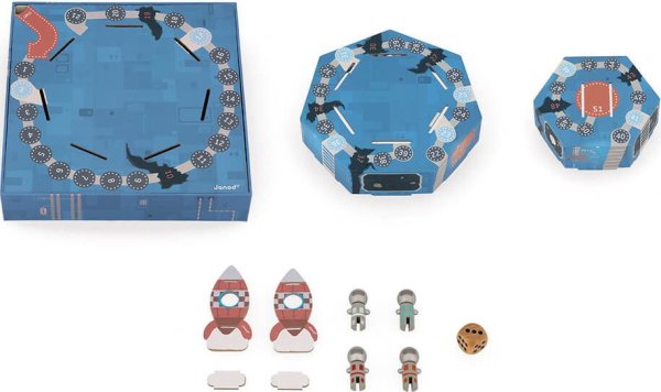 Kto ako prvý dosiahne rakety Janod a opustí planétu? V tejto stolnej hre s vesmírnou tematikou pretekajú malí astronauti o to, kto sa dostane k rakete a odštartuje ako prvý. Hra "Hadi a rebríky" sa vracia v intergalaktickej verzii, k veľkej radosti malých detí, ktoré snívajú o tom, že budú kozmonautmi, aj tých starších, ktoré majú stále hlavu vo hviezdach. Rebrík? Vylezte hore! Šmykľavka? Zídeš dole! 3D hra plná napätia v srdci galaxie, s pravidlami hry známymi všetkým, pre chvíle výmeny a zdieľania s rodinou alebo priateľmi. Hra obsahuje: 4 drevené astronauty, 1 kartónovú raketu, 1 kartónovú 3D hraciu dosku a 1 drevenú kocku, návod.