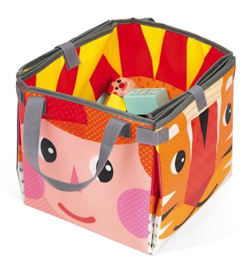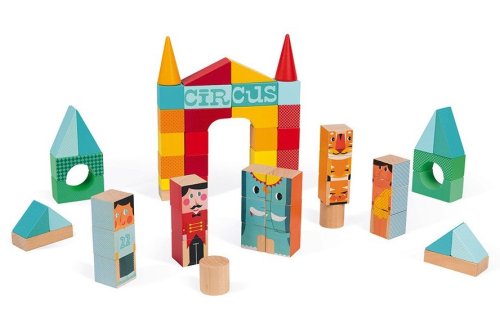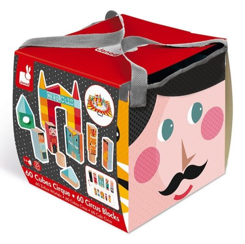 Hor sa do cirkusu! Sada obsahuje 60 krásne maľovaných drevených kociek a podložku s motívom cirkusu. Podložka na hranie sa dá poskladať do tvaru krabice, do ktorej si deti po hre môžu uložiť svoje kocky.