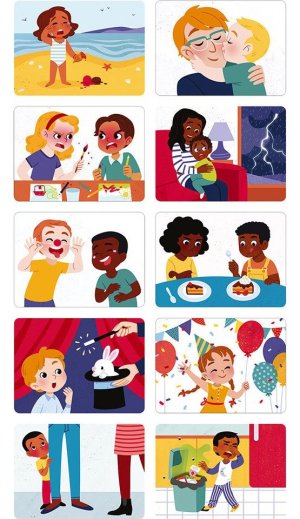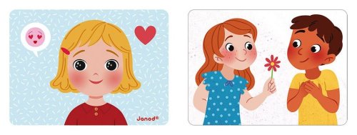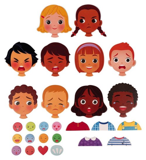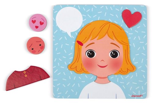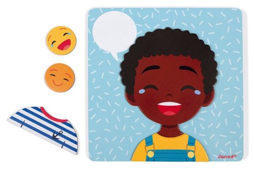 Emócie a pocity - Táto magnetická hra pomôže dieťaťu rozoznať emócie vďaka ilustrovaným kartám, ktoré predstavujú rôzne životné situácie. Na každej karte je zobrazená tvár, ktorá emočne napodobňuje danú situáciu na zadnej strane karty. Pomocou magnetov si dieťa skúsi priradiť jednotlivé výrazy k danej situácii. Existujú 2 úrovne hry: Jednoducho stačí napodobňovať výraz tváre na karte, staršie deti môžu skúsiť uhádnuť, aké emócie zodpovedajú danej životnej situácii. Zrkadlo umožní dieťaťu napodobňovať jednotlivé výrazy. Balenie obsahuje: - 1 drevenú dosku - 27 magnetov (10 tvárí, 10 smajlíkov, 7 ks oblečenia) - 20 kariet zobrazujúcich danú životnú situáciu Vhodné pre deti od 2 rokov.