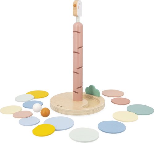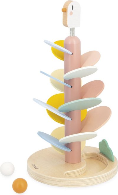 Kreatívna stavebnica je nielen zábavná, ale taktiež rozvíja jemnú motoriku, logické myslenie a pochopenie príčiny a následku. Základňu v tvare kmeňa stromu jednoducho zostaví dospelý – a potom sa už môžu deti pustiť do zdobenia stromu farebnými listami podľa priloženej modelovej karty. K dispozícii je 14 listov v rôznych farbách a veľkostiach. Akonáhle je strom hotový, prichádza na rad zábavný moment: spustenie drevených guličiek! Súčasťou sady sú dve guličky, ktoré sa kotúľajú po listoch a vytvárajú jemnú, opakujúcu sa zvukovú kaskádu. Deti môžu sledovať ich plynulý pohyb – buď jednotlivo, alebo obe naraz – až do miesta, kde sa zastavia v dolnej časti stojana. Edukatívna hračka s jemným dizajnom a prírodnými materiálmi (drevo a plsť) je nielen skvelou zábavou, ale aj krásnym dekoračným doplnkom do detskej izby. Výška stromu je 36 cm, priemer základne 19,3 cm. Hračka patrí do obľúbenej kolekcie Sweet Cocoon a je vyrobená z FSC certifikovaného dreva z udržateľne obhospodarovaných lesov.