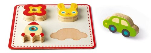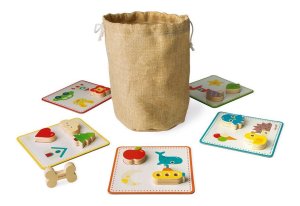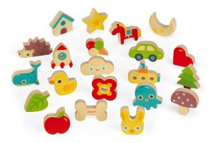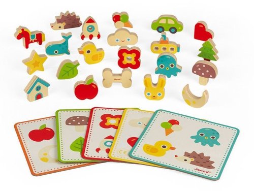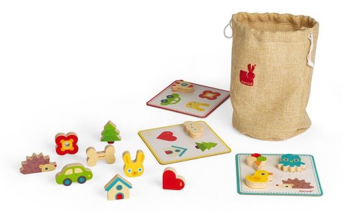 Hmatová hra pre rozvoj jemnej motoriky a rozpoznávania farieb, geometrických tvarov a zvieratiek. Malé deti si môžu karty s obrázkami položiť pred seba az tvarov vybrať a správne priradiť – tvar položiť na správne miesto na kartičke. Ale inak je drevené pexeso určené pre dvoch až päť hráčov. Hráči si rozdajú náhodne kartičky, ktoré si položí každý pred seba. V taške sú uložené drevené tvary. Dohromady ich je 21. Hráči si po jednom náhodne vyberajú z vrecúška predmety a pokiaľ ho majú na kartičke, priložia ho na správne miesto na nej. Vyhráva hráč, ktorý zaplní svoju kartičku najrýchlejšie. ALE POZOR! Jeden tvar je tam navyše. Pokiaľ vytiahneš z vrecúška kocku, musíš vrátiť zo svojej karty predmety späť do tašky. Vhodné pre deti od 3 rokov.