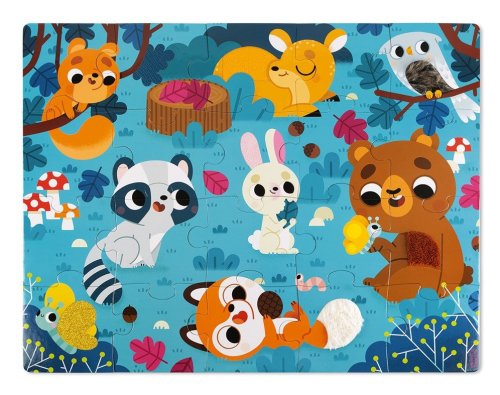 Detské puzzle JANOD s motívom zvieratiek z lesa. Niektoré dieliky majú špeciálnu povrchovú úpravu pre senzorické vnímanie - kožušinka, trblietky, zamat a pod. Vrátane plagátu. Puzzle rozvíjajú logické myslenie, pozornosť a pamäť detí. Pomocou puzzle sa učia rozpoznávať farby, tvary, objekty, rozvíja sa motorika rúk, deti sa učia vnímať vzťah medzi časťami a celkom. Rozmer zloženého puzzle cca 65 x 50 cm