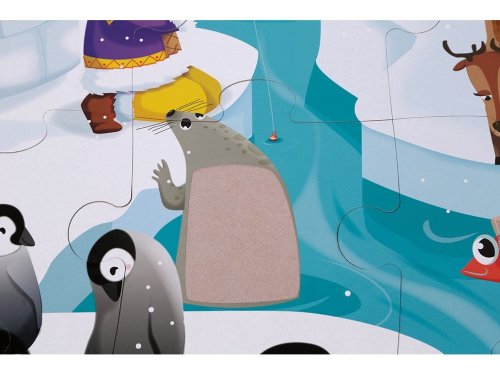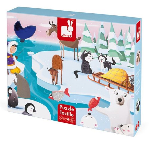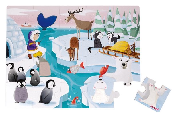 Detské puzzle JANOD s motívom zvieratiek žijúcich za polárnym kruhom. Každým poskladaným kúskom sa vaše deti učia ako vyzerajú polárne zvieratká nielen vizuálne, ale vďaka špeciálnemu povrchu niektorých dielikov puzzle aj dotykom! Puzzle rozvíjajú logické myslenie, pozornosť, pamäť, predstavivosť, rozlišovanie farieb, tvarov a veľkosti. U čí deti vnímať vzťah medzi časťami a celkom a sú užitočné pri rozvoji motoriky rúk. Rozmer zloženého puzzle cca 65 x 50 cm