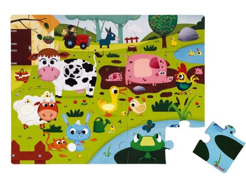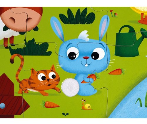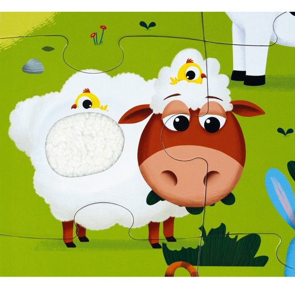 Detské puzzle JANOD s motívom zvieratiek na farme. Niektoré dieliky majú špeciálnu povrchovú úpravu – textúru, ktorá je charakteristická aj pre reálne zvieratá. Puzzle rozvíjajú logické myslenie, pozornosť a pamäť detí. Pomocou puzzle sa učia rozpoznávať farby, tvary, objekty, rozvíja sa motorika rúk, deti sa učia vnímať vzťah medzi časťami a celkom. Vďaka špeciálnym častiam na puzzle sa deti naučia vnímať hmatom rôzne povrchy. Rozmer zloženého puzzle cca 65 x 50 cm
