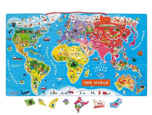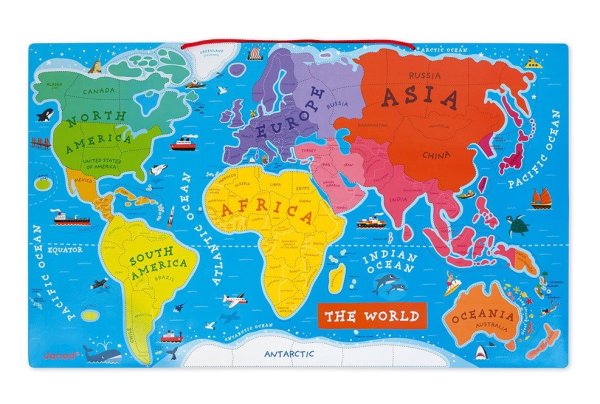 Zábava s magnetmi! Vie Vaše dieťa, kde leží Madagaskar? Na ktorom póle žijú tučniaky? Odkiaľ a kam vedie Transsibírska magistrála? Kde ste boli vlani na dovolenke? Chcete, aby Vášmu dieťaťu aj ďalšie zemepisné pojmy navždy vryli do pamäti? Zaobstarajte mu veľkú mapu sveta s množstvom zaujímavých detailov a naučte ho zemepis hravou formou! Krásna magnetická mapa sveta (rozmery 77 x 46 x 1 cm) obsahuje 92 drevených dielikov puzzle, kde každý z nich reprezentuje región alebo krajinu, nesie názov hlavného mesta a obsahuje obrázok charakterizujúci dané miesto (významné stavby, pamiatky, zvieratá a rastliny z danej oblasti ). Mapa je v anglickom jazyku. Mapu je možné zavesiť na stenu, čím sa stáva mimoriadnym doplnkom detskej izby. Vhodné pre deti od 5 rokov.