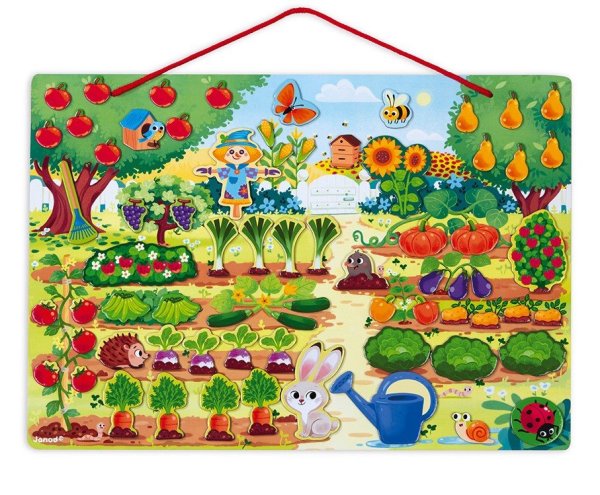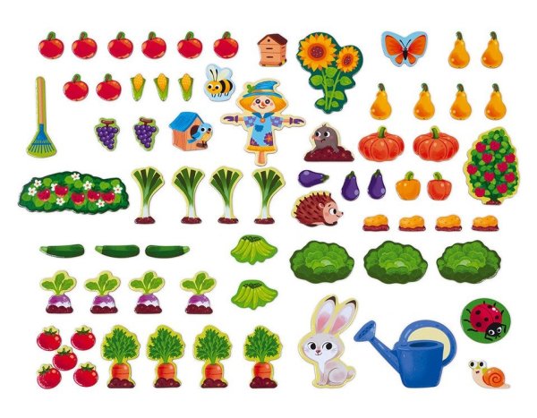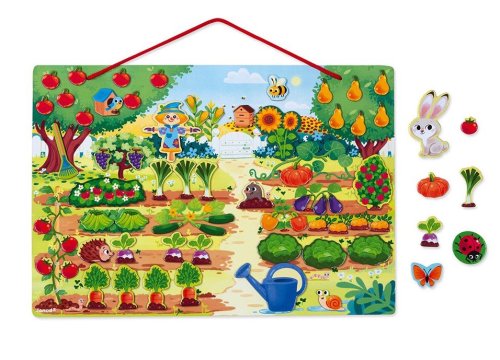 Zábava s magnetmi! Magnetická tabuľa Moja záhrada na zavesenie, na ktorú si deti môžu pripevňovať krásne magnetky so všetkým, čo nájdeme v záhradke. Deti sa vďaka tabuľke naučia, čo všetko sa dá v záhradke pestovať. Záhradku si môžu zalievať, aby im zelenina dobre rástla, aj strašiaka treba svedomito umiestniť, aby zaplašil všetkých škodcov. V balení nájdete aj magnetky zvieratiek, s ktorými sa deti môžu hrať a zároveň sa naučiť, čo všetko jej napríklad králik. Súprava obsahuje 70 magnetiek. Vhodné pre deti od 3 rokov.