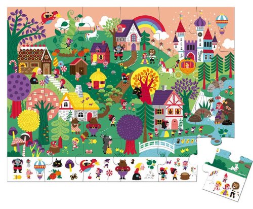 Pozorovacie puzzle JANOD s rozprávkovým motívom. Na okraji poskladaného puzzle sa nachádza niekoľko rôznych obrázkov, ktoré sú zakomponované v ilustrovanom obrázku zložených puzzle. Úlohou dieťaťa je čo najskôr nájsť jednotlivé obrázky. Puzzle sú balené v originálnom a praktickom kufríku so zatváraním, takže sú vždy upratané a zároveň sú pekným doplnkom do detských izbičiek. Súčasťou balenia je aj plagát, ktorý sa môže použiť ako šablóna. Rozmer zloženého puzzle cca 54 x 41 cm