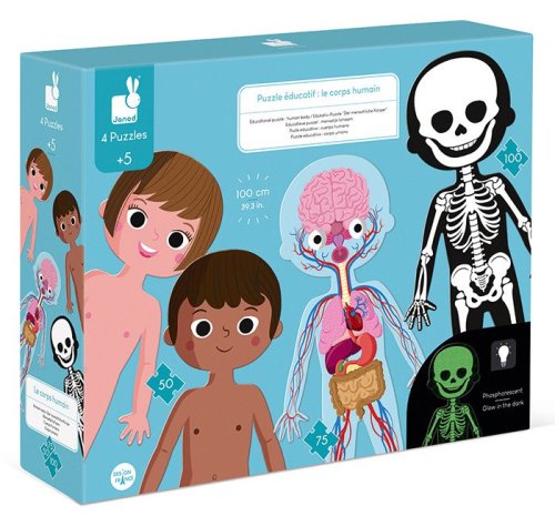 Úžasne hravé poznávanie ľudského tela pre zvedavých školákov! Nádherné vzdelávacie puzzle s motívom Ľudského tela - telo, orgány a kostra, vrátane 4 kariet sústav ľudského organizmu (opis NIE JE v slovenskom jazyku). Deti skladajú puzzle a zároveň sa učia jednotlivé časti a sústavy ľudského tela. Poskladať môžu: - obojstranné telo (50 dielikov) - z jednej strany dievča, z druhej chlapec - orgány (75 dielikov) - kostru (100 dielikov), ktorá navyše svieti v tme. Puzzle rozvíja logické myslenie, pozornosť, pamäť, predstavivosť, jemnú motoriku, a zároveň sa deti učia vnímať vzťah medzi časťami a celkom. Vhodné pre deti od 5 rokov.