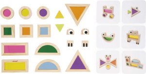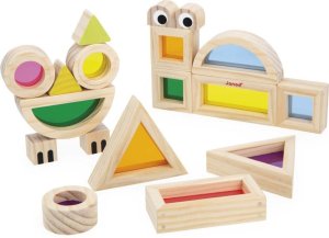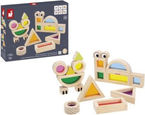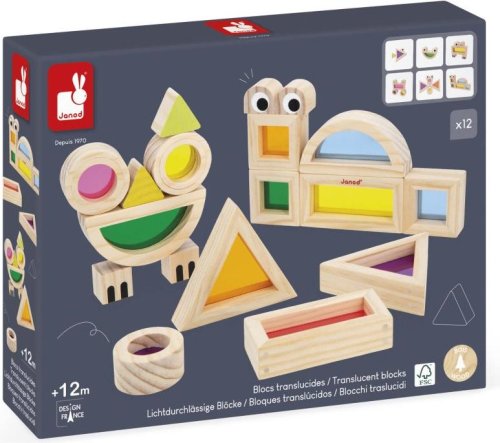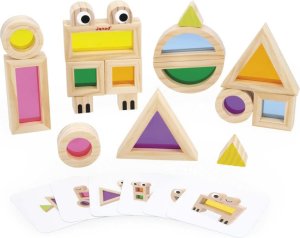 12 farebných priehľadných kociek v rôznych odtieňoch (ružová, modrá, zelená ai.) 6 potlačených drevených blokov pre tvorbu veselých zvieratiek 6 inspiračných šablónových kariet, ktoré pomáhajú s prvými nápadmi a motivujú k vlastnej tvorbe