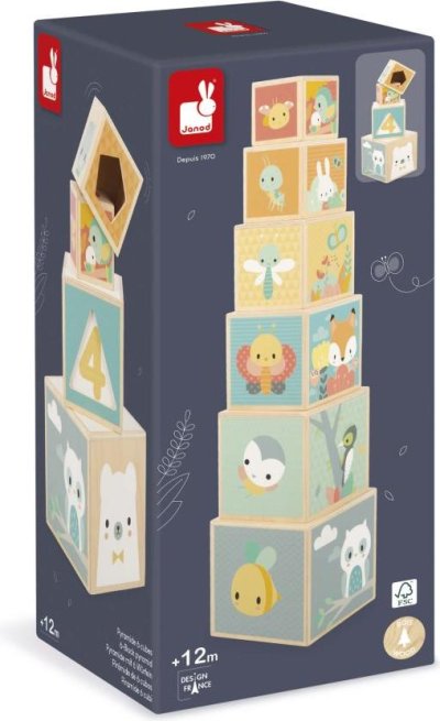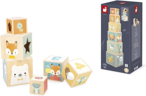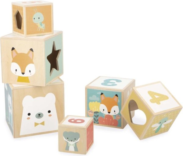 Stohovanie, triedenie a obracanie kociek pomáha deťom pochopiť princípy rovnováhy, veľkostí i priestoru. Hračka zaujme svojim jemným farebným prevedením a láskyplnými ilustráciami, ktoré rozvíjajú predstavivosť.