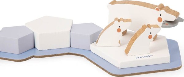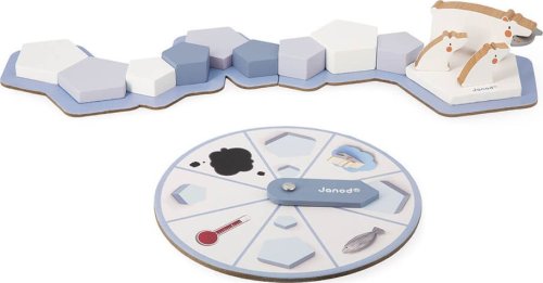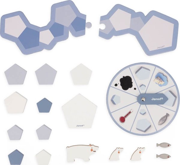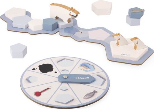 Na ľadovej kryhe je čas obeda! Pomôžte ľadovému medveďovi nakŕmiť jeho mláďatá v tejto spoločenskej hre z dreva a kartónu. Cestou zbierajte ryby a prineste ich hladným mláďatám, ktoré sú na konci ihriska, ale pozor na nástrahy! Topiaci sa ľad, ropné škvrny... Medveď ťa potrebuje! Hrá sa s priloženým kolieskom. Každý hráč roztočí kolo: pristál si na ľadovci? Potom ho umiestnite pred medveďa, ktorý sa môže posunúť o jedno pole vpred. Ryba? Pozbierajte rybu, ktorú môže medveď odniesť svojmu mláďaťu. Teplomer ? Ale nie, ľad topí: odstráňte ľadovec a medveď sa vráti o jedno políčko späť. Ropná škvrna ? Smola, odstráňte ľadovec a medveď sa musí vrátiť o jedno políčko späť. Medveď vo vode? Smola, vracia sa na začiatok! Táto zábavná hra pomôže zvýšiť povedomie detí o ochrane životného prostredia a sľubuje zábavné hodiny hrania s rodinou alebo priateľmi! Hra obsahuje: 1 žetón medveďa, 2 žetóny medvieďat, 2 žetóny rýb, 10 ľadovcov, 1 kartónovú hraciu dosku a 1 kolo s ukazovateľom.