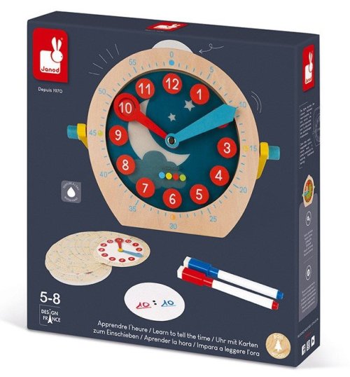 Koľko je hodín? Učím sa hodiny a čas so stierateľnými kartami, na ktoré si Vaše môžu zapísať, koľko je práve hodín. Hodiny pomáhajú deťom pochopiť vnímanie času, jasne očíslované hodiny majú nastaviteľné farebné ručičky z dreva, ktoré sa plynule pohybujú. S týmito hodinami sa čas a jeho plynutie hravo naučí každé dieťa. Balenie obsahuje drevené hodiny, 14 ks stierateľných kariet a 2 farebné fixky. Odporúčané pre deti od 3 rokov.