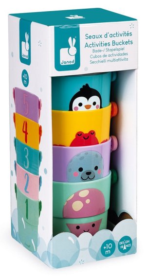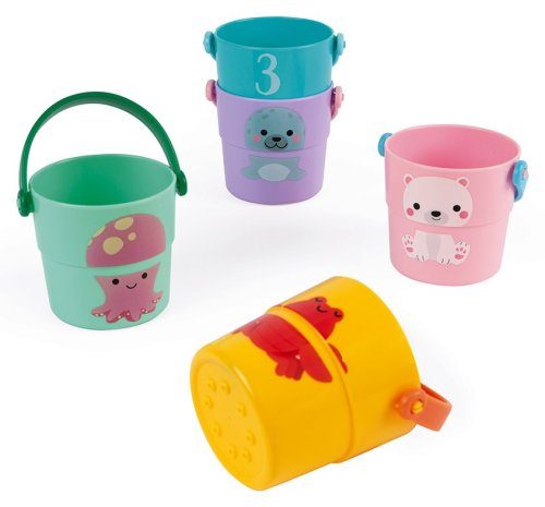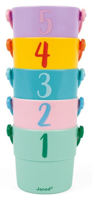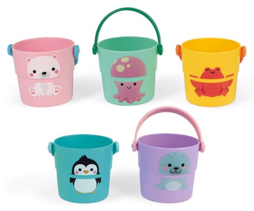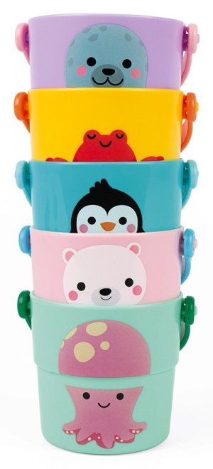 Farebné plastové vedierka do vody s motívom zvieratiek. Päť farebných plastových vedier s rôznymi aktivitami pre dlhotrvajúcu zábavu kdekoľvek vo vode - vo vani, v mori, v bazéne, na záhrade. Vedierka sú stohovateľné a sú očíslované od 1 do 5, vďaka čomu sa deti učia spoznávať číslice.