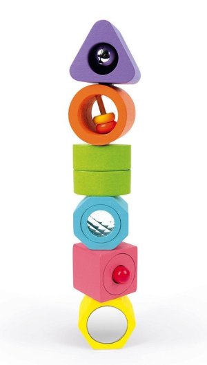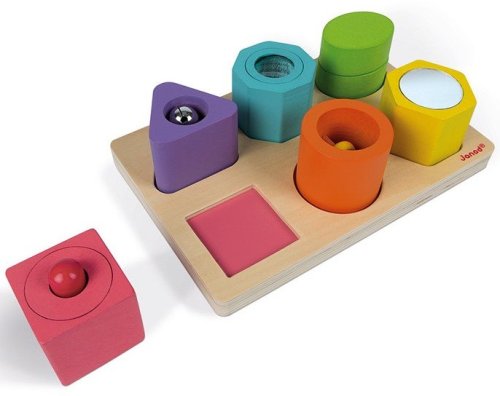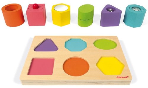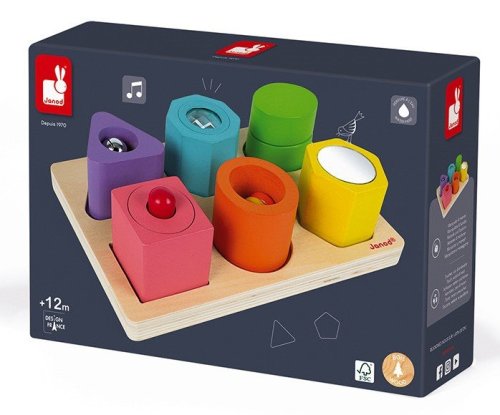 Učenie sa tvarov ešte nikdy nebolo také zábavné! Drevené vkladacie puzzle pre najmenších. Deti sa učia rôzne tvary a farby. Každý komponent vydáva navyše nejaký zvuk alebo má iný aktívny prvok ako napr. zrkadlo. Vhodné pre deti od 2 rokov.