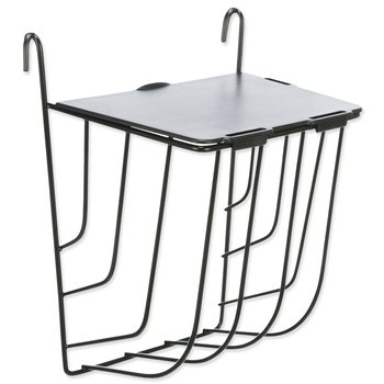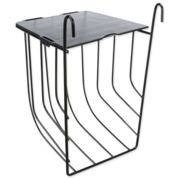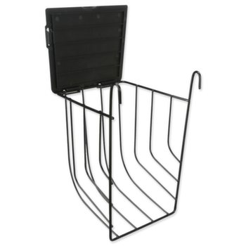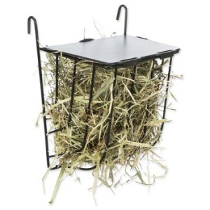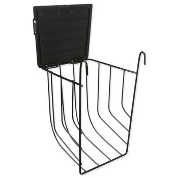 Závesné kovové jasličky na seno s vekom v čiernej farbe.