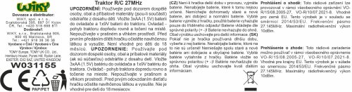JD Kids John Deere RC na diaľkové ovládanie, traktor Johnny. Veľkosť 15,5 cm. Ovládanie - pohyb dopredu a otáčanie sa na mieste. Frekvencia 27 MHz. Ovládač - 3xAA (LR6) batéria nie je súčasťou, traktor 1x9v (6lr61) nie je súčasťou.