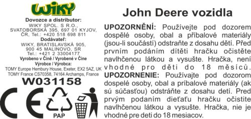 JD Kids John Deere traktor a sklápač set. Veľkosť 16 cm. Sklápacia korba a pohyblivá radlica. Voľné kolesá.