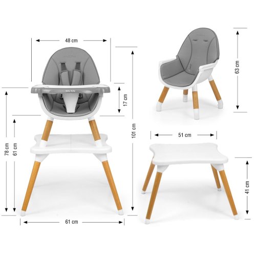 Moderná a štýlová detská jedálenská stolička 2v1 Malmo. Je vyrobená z najkvalitnejších materiálov - kombinuje funkčnosť a moderný design. Verzia vysokej stoličky je určená pre deti od 6 mesiacov do 36 mesiacov alebo pri dosiahnutí hmotnosti 15 kg a verzia nízkej stoličky plus stôl pre deti od 3 do 6 rokov alebo pri dosiahnutí hmotnosti 25 kg.